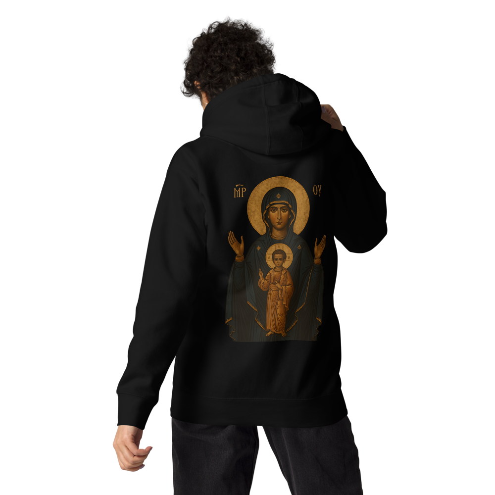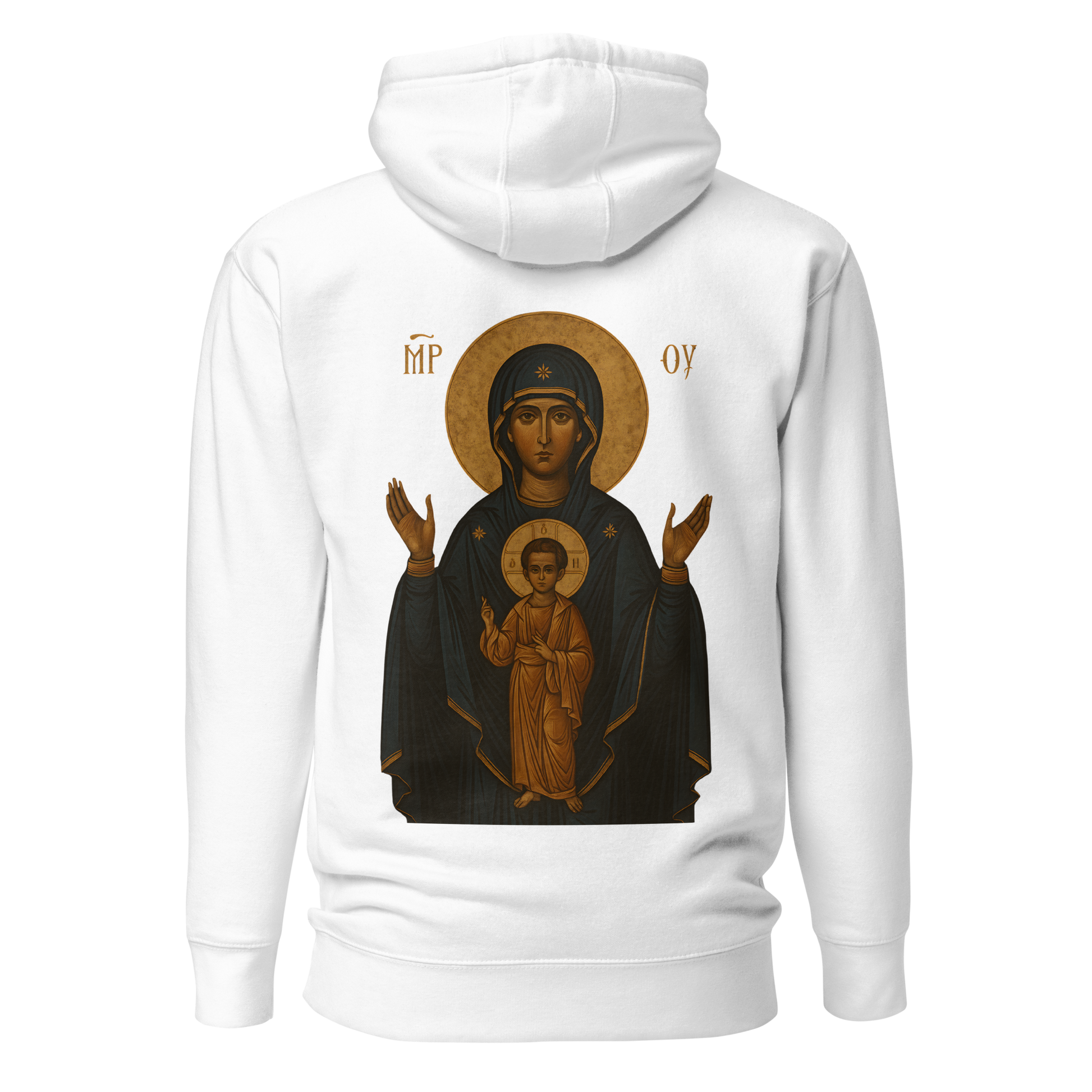 The back features a vivid Theotokos-inspired print — a reverent, artful witness to the Mother of God.